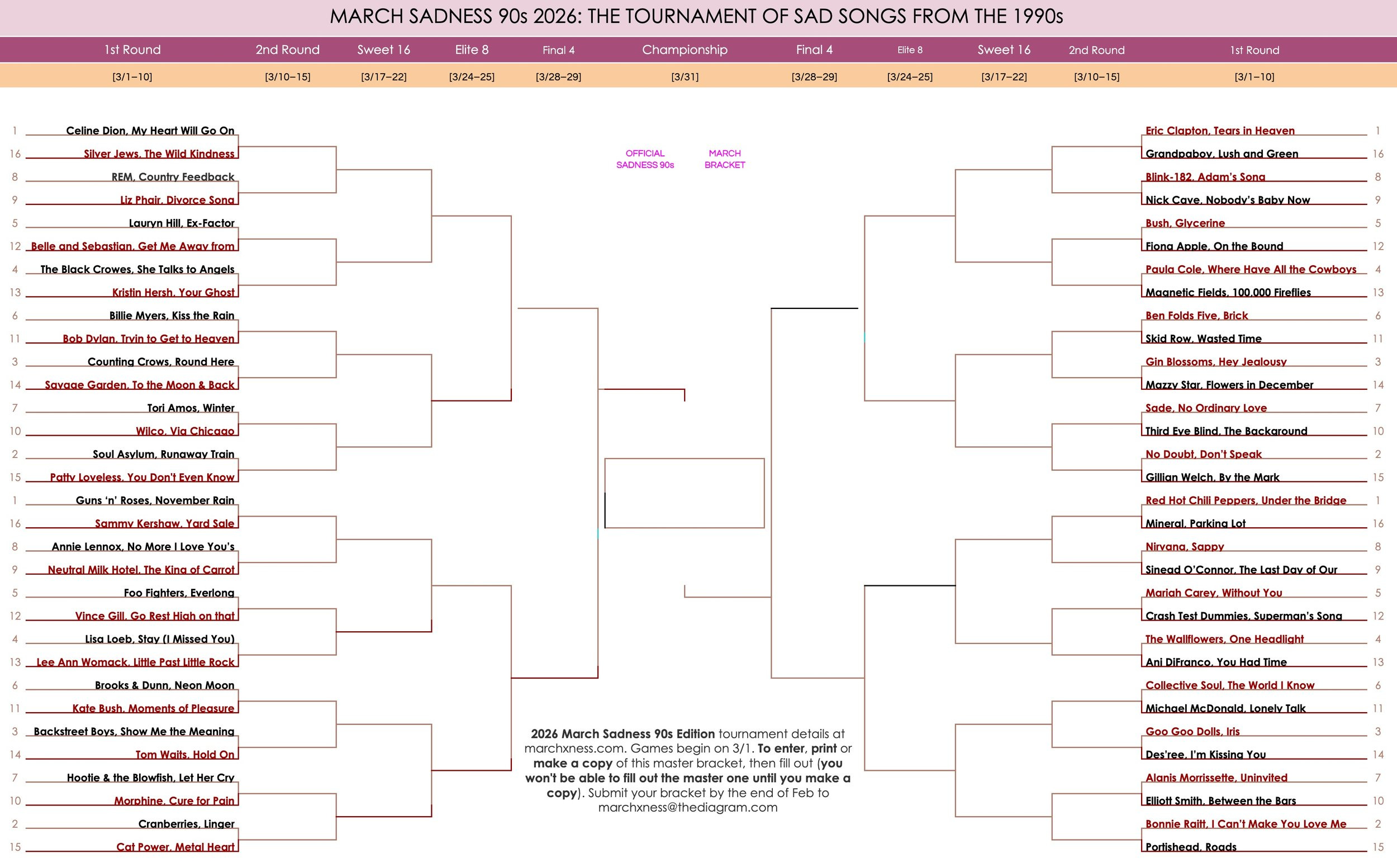Here is the tournament bracket as a fillable Google Sheet (if you use the Google Sheet, you must make a copy before filling it out). You can also download it as a pdf or an Excel file. Fill out your bracket (all you have to do is make your predictions for the winner of each game using whatever criteria you want), name the file with your last name first, and email it to marchxness @ thediagram.com no later than midnight 2/28/26.